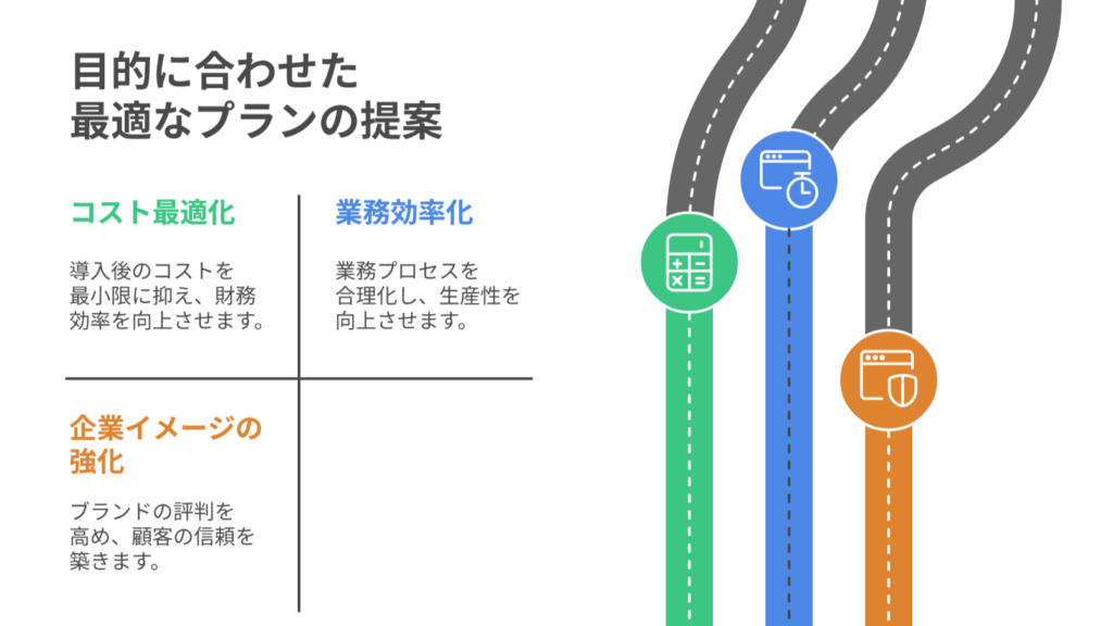 導入後の活用まで見据え、コスト最適化や業務効率化、企業イメージの強化までをトータルに支援します。